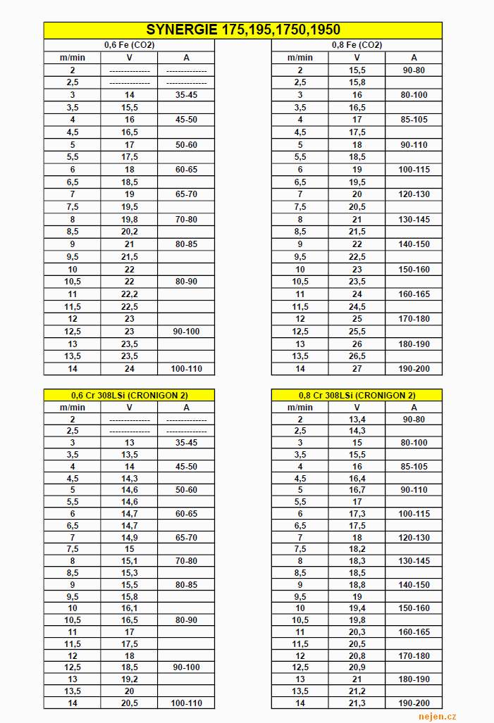 Přikládám přílohu doporučených proudů a napětí pro sváření oceli, nerezu a hliníku svářečky Omicron OMI 175,198,1750,1950 (podobné to ale bude i pro jiné stroje). Celé to je v příloženém pdf ze kterého přikládám i pár screenu pro lidi co si pdfko nezobrazí
