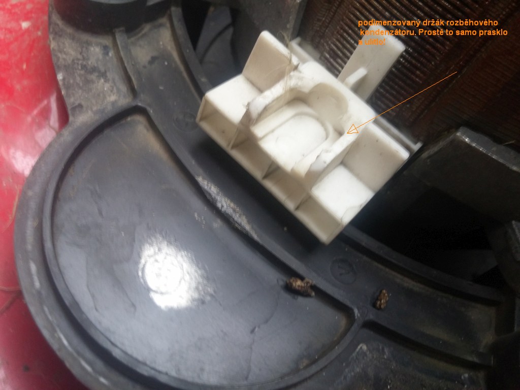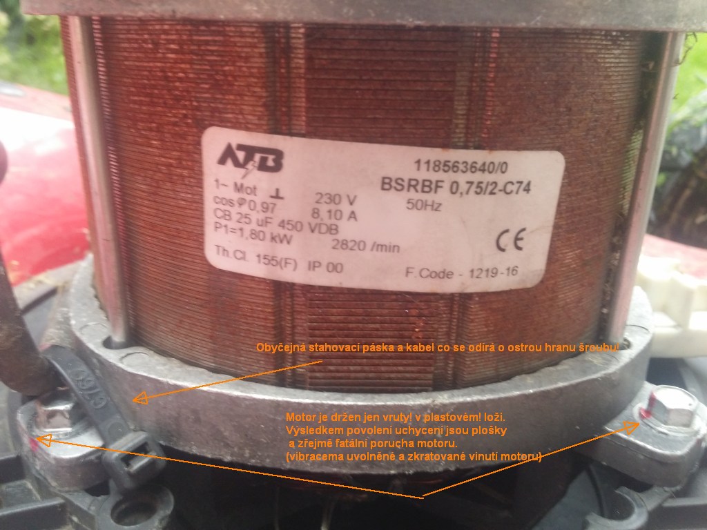 - uchycení motoru je do plastového lože pomocí obyčejných vrutů ! Tyto vruty se velmi rychle povolují a celý motor pak vibruje a vybrušuje si plošky do úchytů