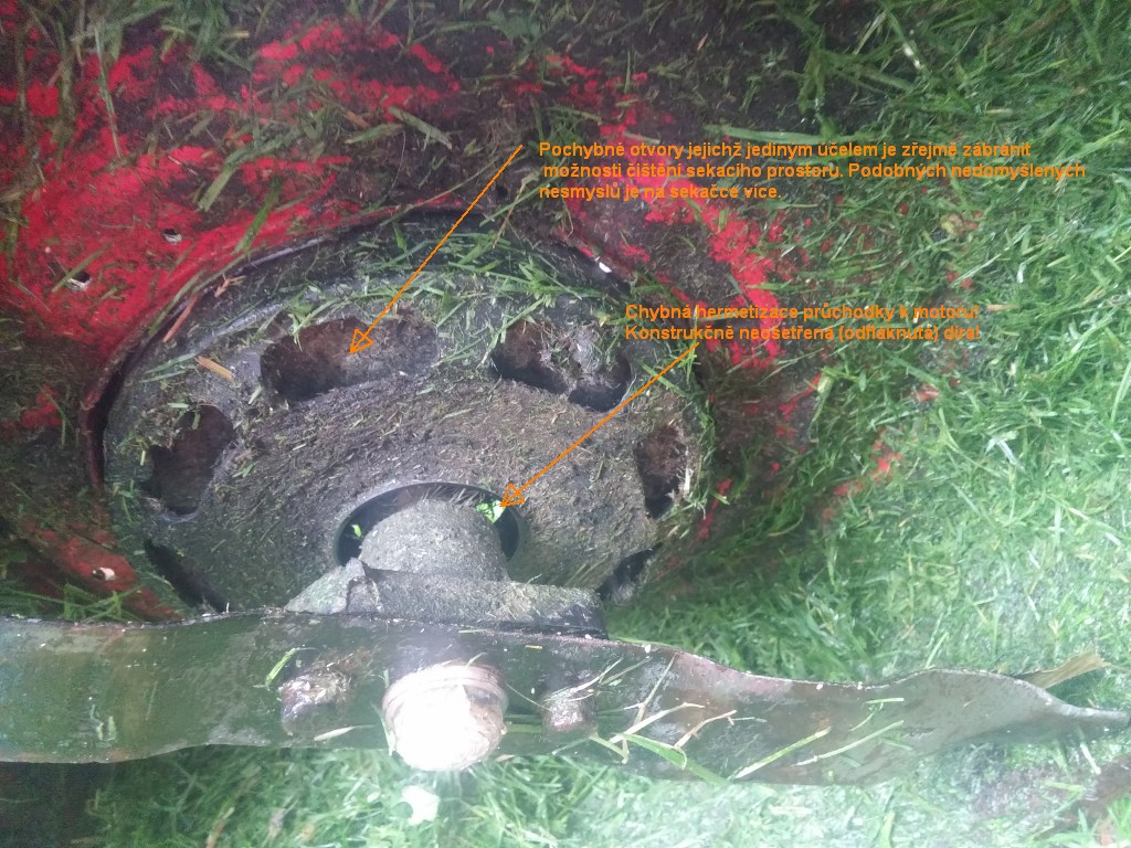 - špatná konstrukce plechového krytu na nůž. Podivná zákoutí, kde se drží mnoho trávy a špatně se čistí. Podle mne chybí nějaký krytka, která by ucpala tyto otvory kterými uniká část vzniklého přetlaku vzduchu (viz foto)