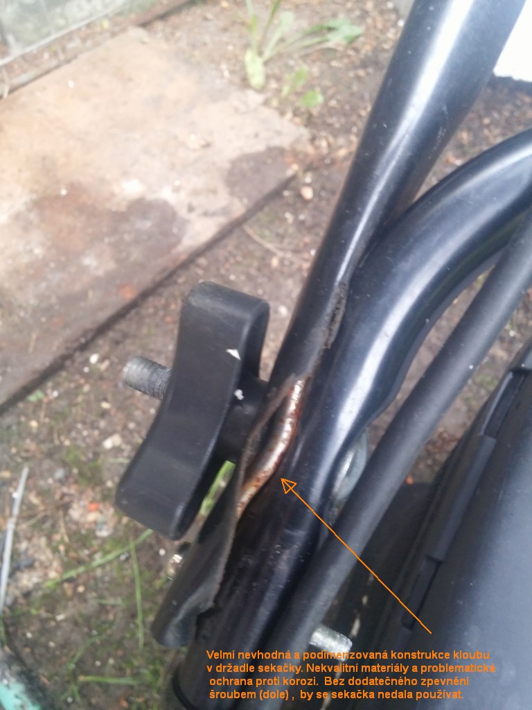 - neskutečně nekvalitní držadlo, které se vzhledem k váze sekačky rychle deformuje a vynklá se. Je to z důvodu použití velmi tenkých ocelových trubek potažených plastem který se v místě spoje kde se držadlo dělí rychle omačká a trubky vzhledem k absenci jakékoli antikorozní ochrany okamžitě reznou. Pokud bych držadla nespojil jedním pevným šroubem navíc na kařdé straně, tak by se s tím nedalo sekat. Zde konstruktér podhodnotil váhu sekačky a sílu se kterou se musí používat.
